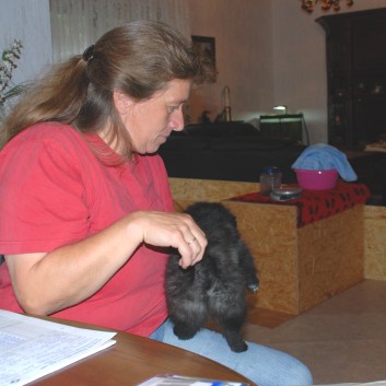 Nach dem Tierarzt ist der Besuch vom Zuchtwart fällig. Der Zuchtwart checkt die Welpen auch noch mal durch. Jetzt geht es aber nicht mehr um Herzschlag und Temperatur. Jetzt wird das Gewicht von der Geburt und von heute notiert und der Welpe wird seiner sichtbaren Farbe zugeordnet. Es wird auch geschaut, ob die Rute korrekt ist, die Zähne in Ordnung sind und kein Nabelbruch vorliegt. Die Chip-Nummer wird überprüft und geschaut das die vorgeschriebene Impfung gegeben wurde. Genauso müssen wir dar legen, wann wir die Welpen drei mal entwurmt haben und mit welchem Medikament. Zum Schluß wird noch die Mama untersucht: Hat sie die Geburt und Aufzucht gut überstanden, geht es ihr gut, liegt kein Kaiserschnitt vor? Sind alle Fragen und Kontrollen zur Zufriedenheit erfüllt, sind wir alle erleichtert. Anschließend kann der Antrag auf Erteilung der VDH/FCI-Papiere dem Zuchtverein zugeschickt werden.